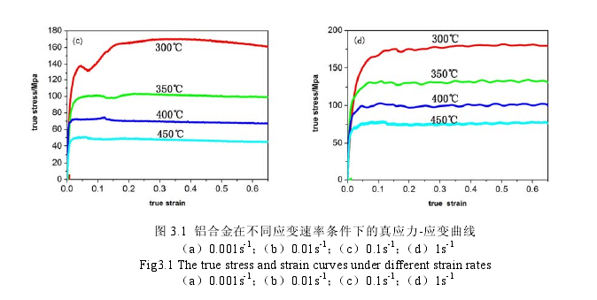 在同一的變形溫度條件下,隨著應(yīng)變速率的提高,峰值應(yīng)力(即曲線上的最高點所對應(yīng)的應(yīng)力)也在增加,比如變形溫度為400 0C時,應(yīng)變速率由0.001 s-‘提高到1 s-‘時,峰值應(yīng)力由29.29 MPa提高到103.4MPa。從而表明該鋁合金是一種正應(yīng)變速率敏感性的材料;