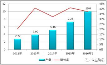 2012-2016年中國負(fù)極材料產(chǎn)量情況(萬噸)