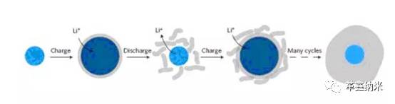 碳包覆機(jī)理在于:Si的體積膨脹由石墨和無定形包覆層共同承擔(dān),避免負(fù)極材料在嵌脫鋰過程因巨大的體積變化和應(yīng)力而粉化。碳包覆的作用是: