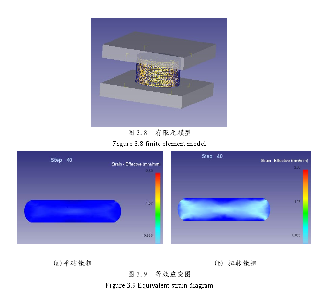 從表 3-6 可以看出,扭轉鐓粗比傳統(tǒng)平砧鐓粗下壓載荷有所減小,這是由于扭轉鐓粗在坯料上施加了扭矩,存在剪應力,從而降低了在鐓粗時所需的下壓載荷。而對于等效應變來說,扭轉鐓粗最大最小等效應變差值比較小,等效應變分布較平砧鐓粗均勻,但是所產(chǎn)生的最大有效應變值相等較小。從圖 3.9 可以看出,相對于平砧鐓粗,扭轉鐓粗的難變形區(qū)域明顯減小,增大了鐓粗對鋼錠心部材料的影響,從而能更好的細化鋼錠的晶粒,使得鍛件質量提高。