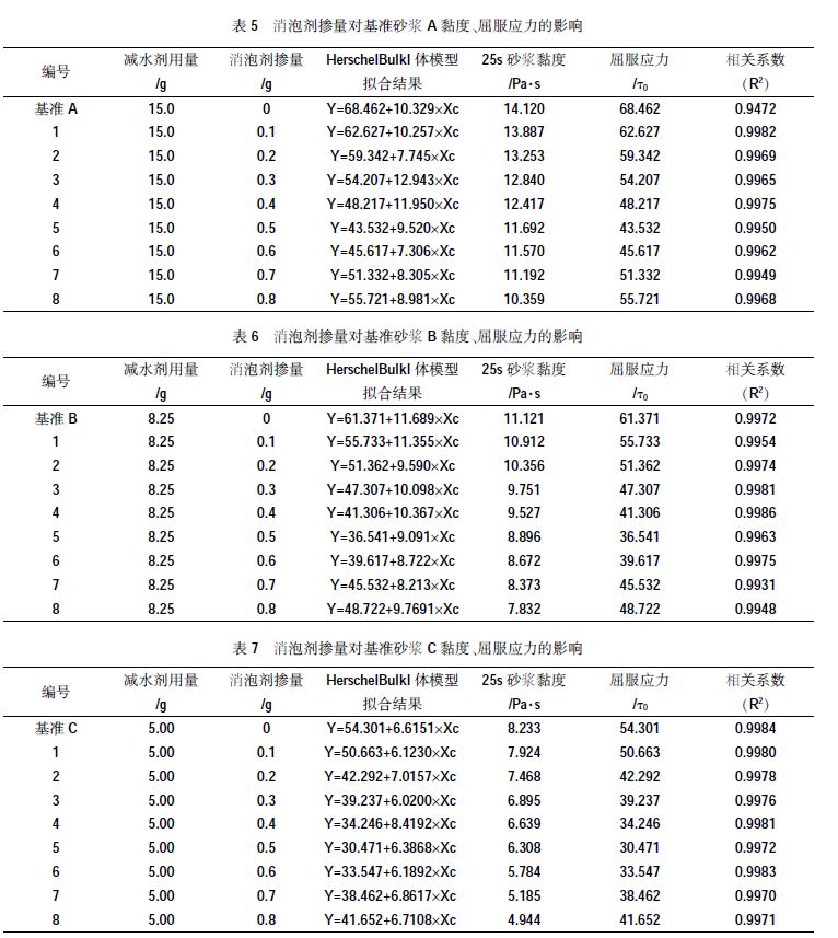 3.2 消泡劑對基準砂漿黏度、屈服應(yīng)力的影響