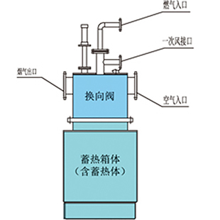 燒嘴由進口風(fēng)箱、蓄熱室(內(nèi)裝蓄熱體)、出口風(fēng)箱及其他輔助部件組成,共四組,一側(cè)為空氣入口或煙氣出口,另一側(cè)為燃氣或煙氣出口。工作時燃氣和空氣呈對角線分布,進入燃燒裝置內(nèi),煙氣也呈對角線分布由燃燒裝置內(nèi)排出。