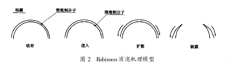 ③采用形成局部薄弱點, 使泡沫破滅, 如使用具有低表面張力點或用憎水固體消泡劑。除此之外, 還有置換泡沫形成體方面用耦合表面活性劑或極性溶劑等等。根據(jù)Robinson 的研究, 消泡劑的消泡過程如圖2所示。